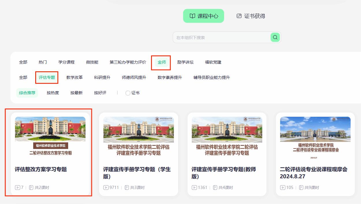 2.登录Open-Q平台(原EDA)——课程中心——“金师”——“评估专题”——评估整改方案学习专题