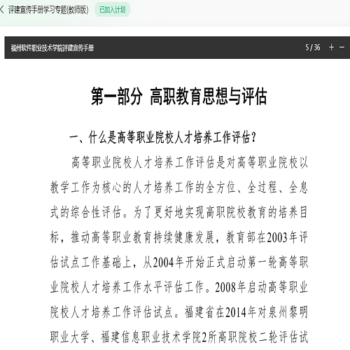 根据《福软评建〔2024〕8号关于开展评建宣传手册应知应会考试的通知》文件要求,智能建造产业学院于2024年4月26日在院部办公室组织开展评建宣传手册相关指示精神学习。此次组织学习,主要为充分提升我院全体教职工对于二轮评建知识的了解和掌握程度,熟悉迎评工作程序,提高深度访谈应答能力;理解评估指标体系内涵,做深做实评建工作。