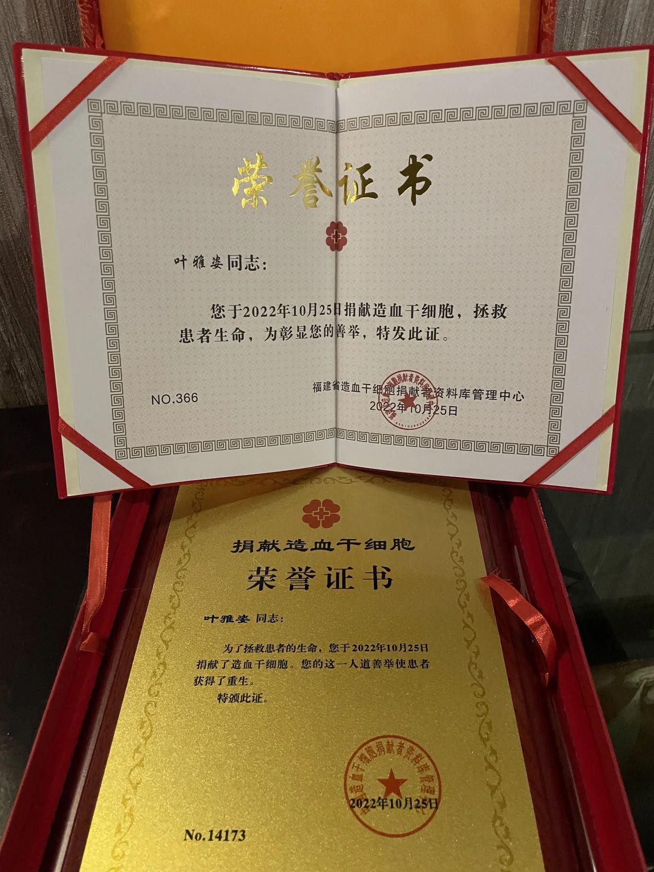 2022年10月,厦门市红十字会通知叶雅姿,她的造血干细胞与一名患者配型成功,叶雅姿毫不犹豫表达捐献意愿:“我是党员,又是退伍军人,还是老师,无论从哪个身份来讲,救人一命都是义不容辞呀!”。2022年10月25日,她成功捐献230毫升造血干细胞,帮助患者重获新生。