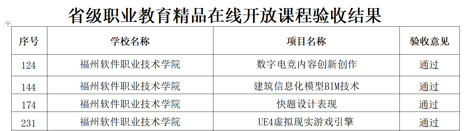 《建筑信息化模型BIM技术》《快题设计表现》《UE4虚拟现实游戏引擎》《数字电竞内容创新创作》4门课程通过省级职业教育精品在线开放课程验收。