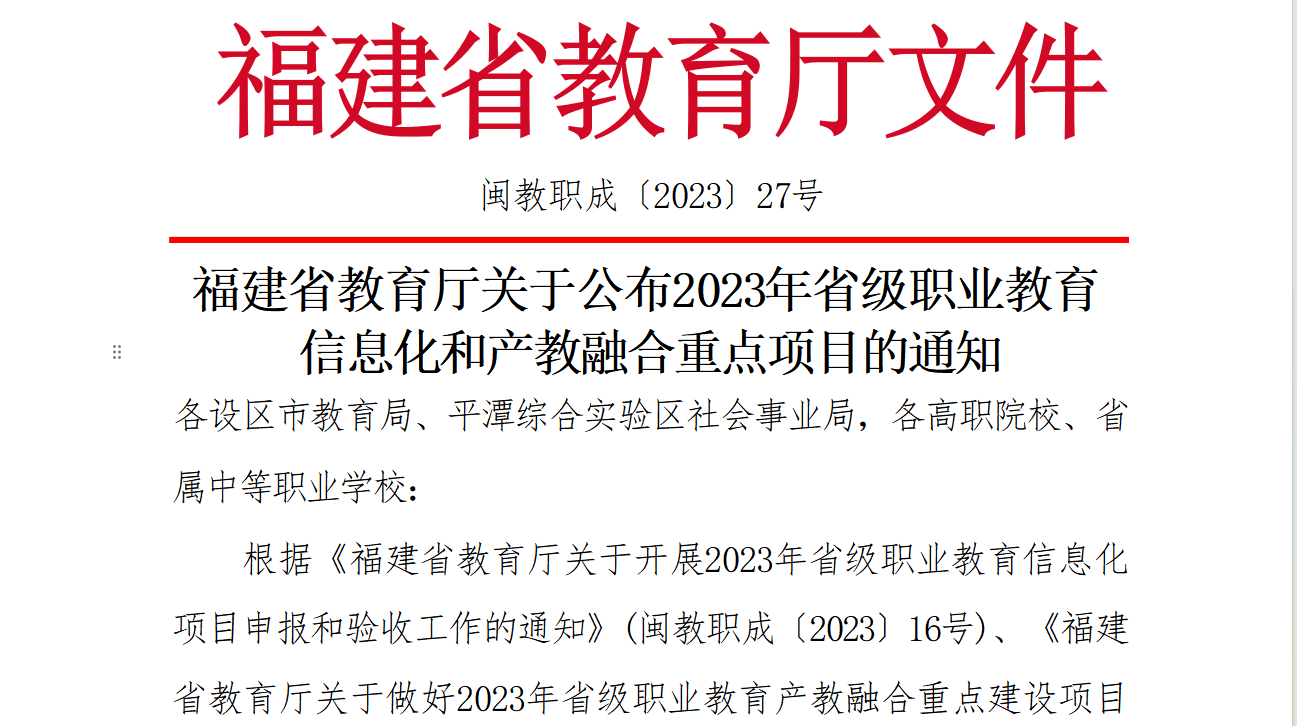近日,福建省教育厅下发《福建省教育厅关于公布2023年省级职业教育信息化和产教融合重点项目的通知》(闽教职成〔2023〕27号)文件,我校共有12个项目成功获批2023年省级职业教育信息化和产教融合重点项目。