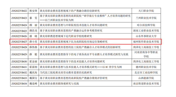 近日,中华职业教育社发布《关于公布第一届黄炎培职业教育思想研究规划课题立项名单的通知》(社发〔2021〕44号),我校马克思主义学院薛小英老师“黄炎培职业教育思想视域下民办高职院校市场定位策略研究”获批立项。